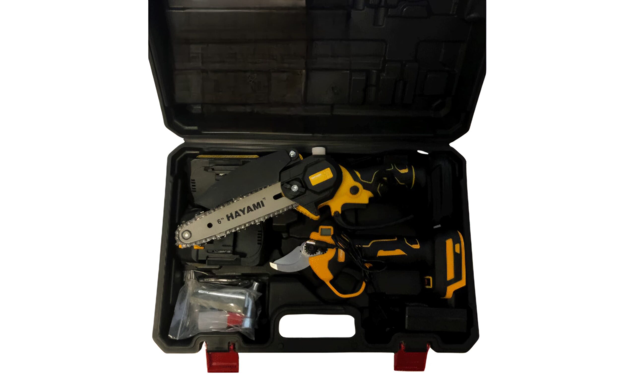 Setul HA04 include o mini drujbă electrică și o foarfecă electrică de grădinărit.