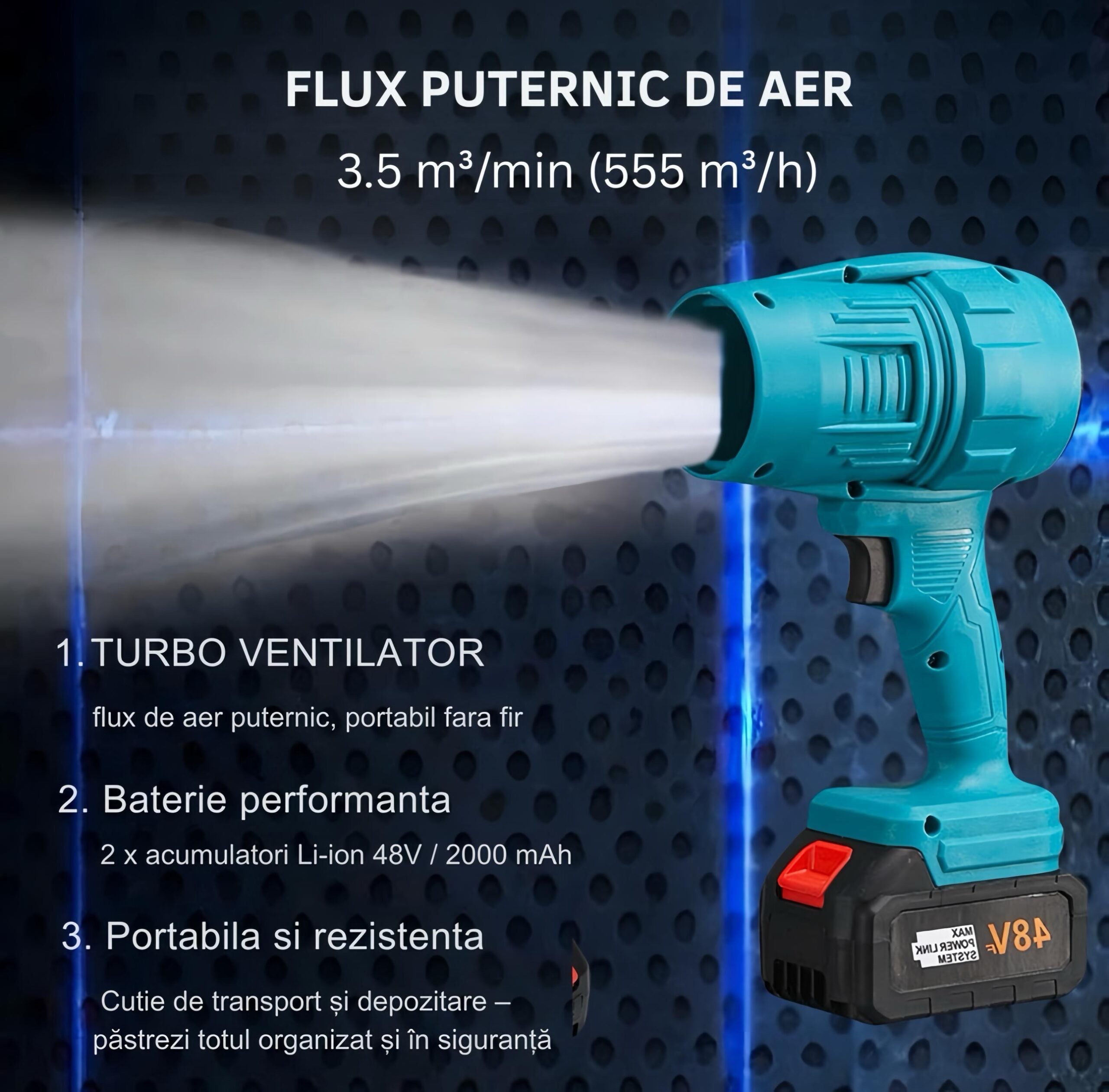 Cu 2 acumulatori, un motor de 22.000 rpm si flux de aer de 3.5 m³/min, elimina frunze,